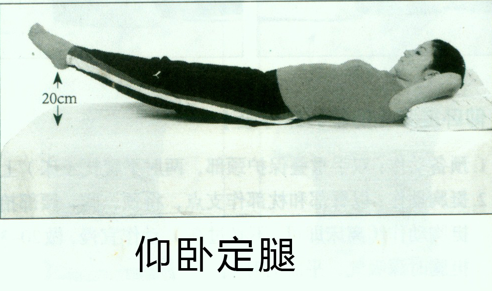 双足并拢,蹬直,足跟离床20厘米处定住,疲劳时放下,呼吸几次后再练,共3次。