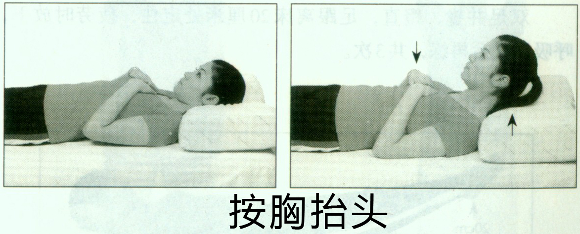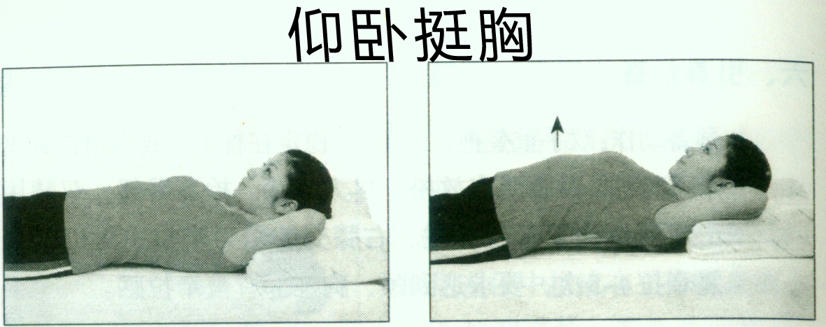 2.挺胸动作:以臀部和枕部作支点,将颈、胸、腰部抬起做挺胸动作(离床即可,不必过高),动作宜慢,做20—30次。挺胸时深吸气,平卧时呼气。