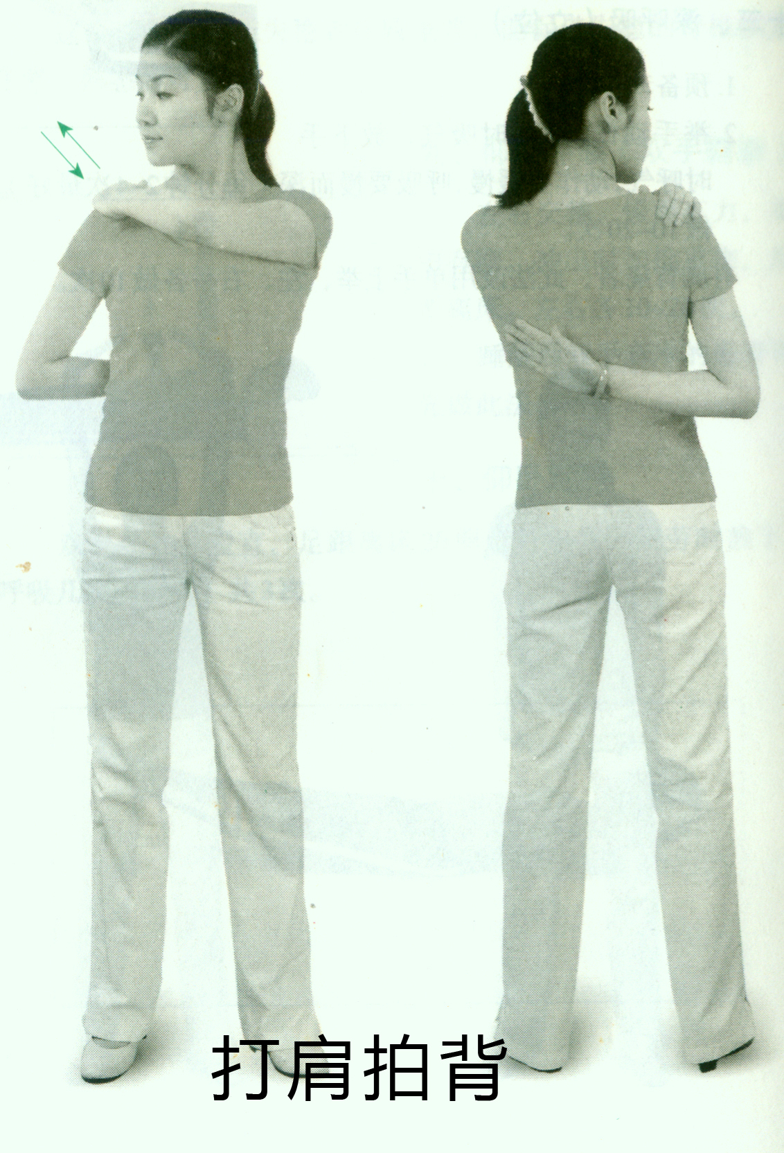 左手打右肩,头向右转,同时用右手手背拍背;然后调过来,用右手打左肩,头向左转,同时用左手手背拍背。左右重复各做20次。